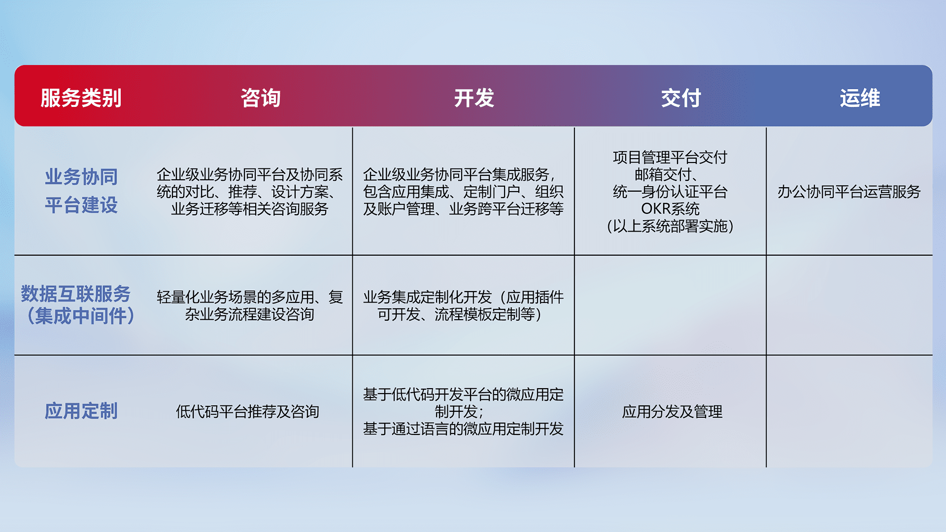 针对钉钉、、企微、、、、IDaas等平台级产品提供产品的规划、、方案、、交付、、、定制化开发等服务,,实现如统一协同办公、、智能客户服务、、混合会议管理、、、、智能数据查询、、、等业务场景,,实现数字化转型。。